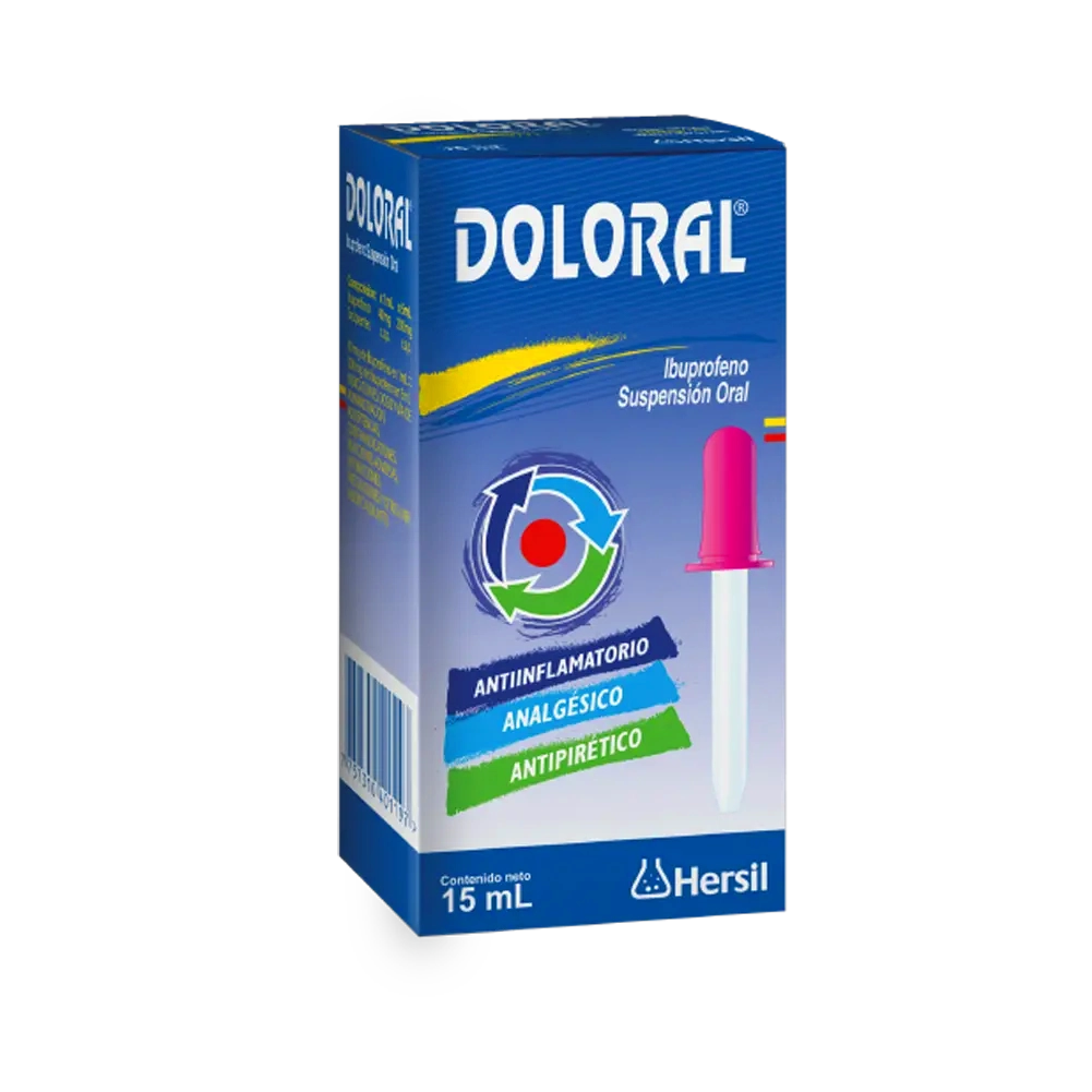 No tome DOLORAL® 40mg/mL Suspensión Oral si es alérgico/a a ibuprofeno o a alguno de los demás componentes de este medicamento, o a otros antiinflamatorios no esteroideos (AINEs) o a la aspirina. Las reacciones alérgicas pueden incluir erupción cutánea con picor, hinchazón de la cara, labios o lengua, secreción nasal, dificultad respiratoria o asma. Tampoco debe tomarlo si padece una enfermedad grave del hígado o los riñones, ha tenido una úlcera o hemorragia de estómago o duodeno, o ha sufrido una perforación del aparato digestivo. No lo use si vomita sangre, presenta heces negras o diarrea con sangre, tiene trastornos hemorrágicos o de la coagulación sanguínea, o está tomando anticoagulantes. Si es necesario usar ambos medicamentos, el médico controlará la coagulación sanguínea. No lo tome si padece deshidratación severa, insuficiencia cardíaca grave o está en el tercer trimestre del embarazo. Siga exactamente las instrucciones de administración del medicamento contenidas en el prospecto o las indicadas por su médico, farmacéutico o enfermero. Conserve el prospecto, ya que puede tener que volver a leerlo. Si necesita consejo o más información, consulte a su farmacéutico. Si experimenta efectos adversos, consulte a su médico, farmacéutico o enfermero, incluso si no aparecen en el prospecto. Debe consultar a un médico si empeora o no mejora después de 3 días en caso de fiebre o 5 días en caso de dolor, 3 días en niños a partir de 6 meses, o si en niños de 3 a 5 meses los síntomas empeoran o persisten después de 24 horas. Este medicamento se utiliza en niños a partir de 3 meses, adolescentes y adultos para el alivio sintomático de los dolores ocasionales leves a moderados y en estados febriles.